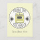 Carte postale recette illustrant un arrière - plan blanc cassé et un cercle blanc au centre. Illustration d'un poêle jaune rétro avec un coeur de chaque côté et texte au-dessus et au-dessous qui dit "De la cuisine de" cercle intérieur. Personnalisez avec votre nom en bas. En face, un rectangle blanc avec des bords grises et des angles de photo à l'ancienne à droite. Le texte à l'intérieur du rectangle dit "Recette". Recherchez les articles correspondants chez Jill's Paperie.