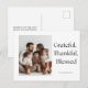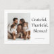 Envoyez de la chaleur et de la gratitude en cette période de fêtes avec cette carte de remerciement photo Grateful, Thankful, Blessed (Reconnaissant, Reconnaître, Bénie). Caractérisé par une police serif intemporelle, un fond blanc épuré et un espace pour votre photo de famille personnalisée, ce design minimaliste allie l'élégance à une simplicité sincère. Parfait pour les réunions de Thanksgiving, les célébrations d'automne ou simplement pour envoyer des bénédictions à vos proches. Personnalisez avec le nom de votre famille pour créer une carte de vacances inoubliable qui sera chérie.