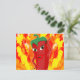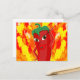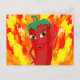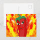 Un personnage de dessin animé rouge et poivre chaud. Design original. Flammes de feu dans l'arrière - plan. Cartes postales personnalisées. Idée de décoration cadeau pour les amateurs de cuisine épicée.