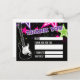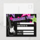 Fête d'anniversaire de rock star avec guitare et étoiles roses, violettes et vertes sur fond noir. Carte de remerciement à compléter.