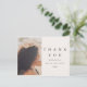 Cette carte de remerciement de fiançailles moderne et minimaliste avec un motif noir et taupe présente une écriture élégante et une photo avec un message de remerciement éditable et l'adresse de retour au verso.
