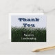 Exprimez votre appréciation à vos clients fidèles avec cette carte postale promotionnelle peu coûteuse. La carte postale présente de l'herbe vert foncé peinte et un "ciel" bleu clair. "Merci" apparaît derrière les brins d'herbe. Le nom de votre entreprise apparaît dans une police blanche professionnelle sur le fond de verdure. Le verso de la carte permet suffisamment d'espace pour des mots de remerciement supplémentaires qui peuvent être personnalisés en fonction des besoins de votre entreprise.