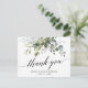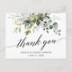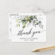 Carte de remerciement de mariage à la calligraphie moderne élégante avec botanique à l'aquarelle comprenant des feuilles d'eucalyptus, du feuillage botanique vert, des feuilles de bleu poussiéreux et d'autres verdures botaniques magnifiques.