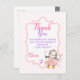 Cette carte de remerciement est un moyen parfait pour dire merci à vos invités de fête. Elle peut être utilisée pour les anniversaires d'enfants ou les occasions de baby shower. Elle présente un cadre décoratif rose pâle avec un bébé manchot en carton vêtu d'un tutu rose en train de faire tournoyer un ruban rose. Le fond a un motif rayé rose pâle. Peut être personnalisé en modifiant le texte puis en le personnalisant avec un nom. Articles de fête assortis disponibles chez suziigifts.