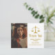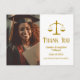 Cartes de remerciement élégantes pour diplômés en droit avec la balance de la justice à côté de votre photo de remise de diplômes. Personnalisez ces cartes de remerciement d'avocat avec une écriture chic dorée à côté de votre photo d'avocat.