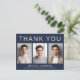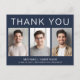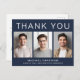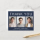 Carte de remerciement de remise de diplôme avec fond bleu marine foncé moderne avec 3 photos du diplômé et "Merci," le nom du diplômé, l'école et l'année de promotion en typographie blanche simple. Personnalisez votre message de remerciement au dos et ajoutez votre nom dans une écriture ressemblant à une signature.