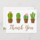 Une illustration moderne de cactus vert et rose constitue ce design de remerciement simple et coloré. Il y a quatre types de cactus épineux dans des pots en terre cuite marron, deux avec de grandes fleurs roses voyantes et deux sans. Qu'est-ce qu'on n'aime pas chez ces belles plantes succulentes brillantes ?