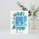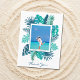 De superbes feuillages botaniques de plage bleu-vert ornent cette magnifique carte de remerciement de mariage de destination. Créez vos propres cartes de remerciement spéciales en ajoutant votre photo personnalisée de votre mariage sur une île tropicale. Un modèle de couple heureux et souriant attend votre photo personnalisée avec des feuilles de palmier.