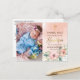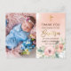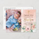 Élégante carte de remerciement pour baptême photo.. Conception avec fond aquarelle rose pêche, rose blush et cadre ovale géométrique doré et arrangement floral sur le devant avec croix dorée et Baptême en écriture or feuille. Ajoutez plus de détails au verso de la carte. Pour modifier ce modèle, cliquez sur personnaliser davantage.