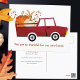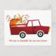Une carte postale d'annonce de déménagement de Thanksgiving mignonne avec un camion de ferme rouge amusant qui transporte des citrouilles d'un champ de citrouilles d'automne. Nous avons une nouvelle maison cet automne avec des couleurs festives rouges et orange. Une carte postale de changement d'adresse de vacances élégante.