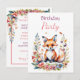 Une douce petite renardeau entourée de fleurs roses et bleues illustration aquarelle carte d'invitation pour la fête d'anniversaire de la fille.
