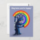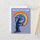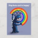 Carte postale Stay Home avec un monstre drôle en bleu avec des dents acérées et des pointes sur le dos tenant un arc-en-ciel, heureux excité, et le texte personnalisable "Restez à la maison et soyez heureux!". Cette jolie illustration numérique folle est colorée et amusante et apporte une humeur joyeuse pour vous encourager.
