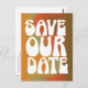 Annoncez votre grand jour avec cette carte postale retro d'inspiration, avec une typographie super audacieuse contre un arrière - plan à gradient chaleureux. Idéal pour les couples qui ont un thème mariage vintage, boho ou éclectique, ce design ludique capte l'essence du style les années 70 tout en restant moderne et attrayant. Idéal pour les couples d'esprit libre qui veulent que leurs détails mariages se démarquent et laissent une impression durable.
