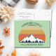 Carte postale personnalisée cool pour la réunion de famille invitation pour un rassemblement d'automne avec cousins, tantes, oncles et grands-parents. Invitation toute l'équipe avec votre nom de famille et l'année en vert autour de la belle image coucher de soleil d'automne sur les montagnes et les arbres. Conception d'un voyage de camping de groupe personnalisé.