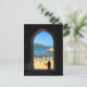 Carte postale d'un homme se dresse à l'ombre d'une ancienne arcade donnant sur une belle plage de Cefalu, en Sicile. Photographie numérique par Sue Melvin