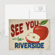 Une carte postale de voyage vintage Riverside California pleine de charme avec une belle pomme rouge, et un texte amusant de style rétro qui dit : "Voir à Riverside"