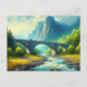 Un majestueux pont de pierre enjambe une rivière qui coule, sur fond de montagnes vertigineuses baignées de lumière du soleil. Des forêts verdoyantes de part et d'autre de la rivière ajoutent à l'atmosphère paisible et sereine.