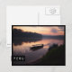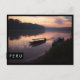 Carte postale avec un bateau sur la rivière Tambopata dans la forêt amazonienne dans l'est du Pérou près de la frontière brésilienne au lever du soleil avec un bord noir et le texte : 'Pérou'.