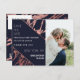 Motif en marbre bleu marine et or rose moderne, élégant et chic imprimé sur des cartes postales Save-the-Date mariages alignées en diagonale. Ce design classique et sophistiqué est parfait pour le couple marié branché et élégant. Personnalisez avec votre propre message sur l'avant ainsi qu'avec un premier monogramme customisé sur l'arrière. Toute la conception d'impression photo.
