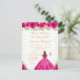 Cette invitation élégante et glamour pour un anniversaire sweet sixteen présente une belle princesse aux cheveux brun-roux et à la peau claire dans une robe de bal rose chaud. Le texte combine une écriture manuscrite et des polices modernes sans serif pour un look classe et sophistiqué. Les arrangements floraux, les papillons et les confettis dorés créent le parfait mélange de rustique et de chic.