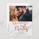 Rose Gold Foil Script Marble Mariage Postponement Carte Postponement avec faux rose feuille d'or manuscrit dans une police de trait de brosse tendance sur marbre classique moderne. Si votre date de mariage a dû être changée, c'est une excellente façon de le faire savoir à votre invité. Ajoutez facilement votre propre photo et vos détails !