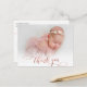 Elégant Rose de calligraphie moderne Gold Script Nouveau-né Baby Photo Merci Postcard. Dispose d'un beau texte "merci" dans une police de calligraphie manuscrite en feuille d'or rose rose FAUX. À l'arrière, le message personnel pré-fait en noir et blanc. Facile à personnaliser avec votre photo bébé et les détails.