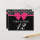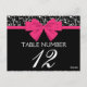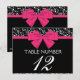 Cette carte de numéro de table mariage présente un élégant motif rose noir et blanc, un arc rose chaud et du texte blanc sur un arrière - plan noir. Il est imprimé de chaque côté.