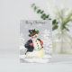 Jolie oeuvre vintage de Noël. Rosy jouait gros bonhomme de neige avec des mitaines rayées rouges, un manteau formel noir et chapeau de dessus noir avec une bande de sainte et de baies. Pins couverts de neige dans l'arrière - plan.
