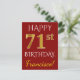 Cette carte de voeux d'anniversaire personnalisée simple présente le message "Joyeux 71e ANNIVERSAIRE", avec le "71e" ayant une apparence faussement dorée. Le devant comporte également un nom personnalisé, et un fond rouge. Le verso comporte un message de voeux d'anniversaire personnalisé, ainsi que l'adresse personnalisable du destinataire de la carte d'anniversaire. Elle pourrait être envoyée à quelqu'un qui célèbre son soixante-et-onzième anniversaire. [~Z0000071]