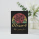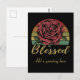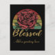 Envoyez cette carte postale de style vintage en détresse avec votre propre message personnalisé au recto et au verso. Caractéristiques d'une rose rouge classique devant un fond de coucher de soleil rétro en détresse et le mot "Bénie" en police dorée.