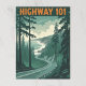 Une affiche de voyage de style rétro représente l'autoroute 101 qui serpente le long d'un littoral spectaculaire, flanqué de grands pins, avec des vagues de l'océan qui s'écrasent contre le rivage sous un ciel doux et nuageux. "HIGHWAY 101" est audacieusement affiché en haut.