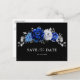 Elégant mariage à thème bleu royal blanc argent enregistrer la carte postale date avec élégant bouquet de bleu royal, marine, argent, blanc pur de couleur rose bourgeons et sauge vert eucalyptus feuilles. Veuillez me contacter pour toute aide sur la personnalisation ou si vous avez besoin d'un autre produit avec ce design.