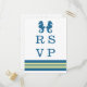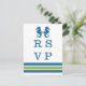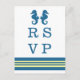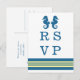 Elégante et classique Mariage de cheval de mer réponse Carte postale avec une paire de hippocampes simples et un ensemble de bandes en bleu marine foncé et jaune. Cette carte postale RSVP sur la plage nautique peut être facilement customisée avec vos coordonnées mariages. Pour plus d'options de personnalisation, cliquez sur le bouton Customiser.