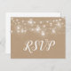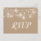 Cartes postales RSVP de mariage personnalisées abordables avec un modèle facile à utiliser pour la personnalisation. Ce design rustique chic présente des brins de lumières à cordes brillantes et des jarres de maçon sur un arrière - plan en papier imitation kraft. Personnalisez le modèle avec les détails de la réponse du mariage - y compris les options de repas si nécessaire - ou customisez le texte à utiliser pour n'importe quel événement. Utilisez les outils de conception pour choisir n'importe quelle couleur arrière - plan, ajouter des photos et customiser les polices de texte et les couleurs pour créer un design unique pour votre mariage.
