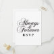 Carte postale de réponse toujours et jamais Mariage, tendance et chic, avec une belle conception de texte de typographie manuscrite en noir et blanc. Cette carte RSVP simple et élégante donne le ton à un mariage élégant et romantique et se customise facilement avec vos détails de mariage. Cliquez sur "Customiser" pour trouver d'autres options de personnalisation. La couleur Arrière - plan peut être changée en n'importe quelle couleur.