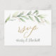Elégante carte postale RSVP avec une aquarelle illustrant le feuillage vert et or.