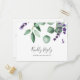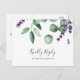 Cette carte postale RSVP à la carte de lavande rustique est parfaite pour un mariage extérieur simple et élégant. Le design floral présente des feuilles d'eucalyptus aquarelle et de la verdure avec des sprigs de fleurs sauvages violets. Cette carte postale de réponse mariage demande à la clientèle quel repas elle souhaite à la réception.
