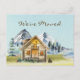 Voici notre Rustic Vintage Mountain Cabine Lodge We Moved Postcard. Doté d'un cabine douillet niché dans une pinède verte brumeuse, parfait pour les amoureux de la nature et les amateurs de randonnées, ce paysage serein capture la beauté des bois et le calme de la forêt dans le style vintage.