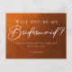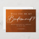 Suivez la tendance d'automne des tons terreux avec notre brûlé orange à brun dégradé automne Will You Be My Bridesmaid carte postale invitation. Une simple typographie blanche sur un arrière - plan rustique pour un look minimaliste. Les teintes bohémiennes qui rappellent l'argile de terre cuite mettent en valeur votre élégante calligraphie sur cette carte de proposition de fête de mariée texturée à la mode.
