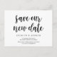 Il s'agit de la fête de mariage ou toute invitation de célébration Rescheduled (reporté / report) carte postale (enregistrer notre nouvelle date), dans le design rustique moderne de ferme thème, Font Noir. C'est la meilleure façon de faire en sorte que l'événement replanifie le faire-part à votre famille et à vos amis.