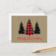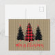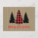 Rustic farmhouse holiday design fea trio of Evergreen tree silhouettes, one in red and black buffalo plaid, texte "Merry Christmas" in solive red, et a muted vintage striped background