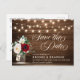 Lumières rustiques à cordes de pays et bocal de maçon avec bordeaux, rouge, marsala, marron, ivoire, bouquet floral de couleur rousse et eucalyptus feuilles sur le mariage arrière - plan de bois enregistrer la date carte postale. Veuillez me contacter pour toute aide sur la personnalisation ou si vous avez besoin d'un autre produit avec ce design.