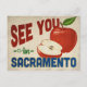 Une carte postale de voyage vintage Sacramento California avec une jolie pomme rouge, et un texte amusant de style rétro qui dit : "Voir à Sacramento"