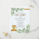Cette carte postale d'invitation à baby shower thème de safari dans la jungle est sûre de faire sourire vos amis et votre famille quand vous les invitations à votre baby shower pour une fille ou un garçon. Ce design neutre pour les deux sexes présente un petit lion doux encadré par des feuilles botaniques d'eucalyptus et des garnitures en or.