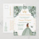 Cette invitation d'anniversaire sweet sixteen élégante et glamour présente une belle princesse aux cheveux bruns dans une robe de bal vert sauge. Le texte combine une écriture manuscrite et des polices modernes sans serif pour un look classe et sophistiqué. Les arrangements floraux, le papillon et les confettis dorés créent le mélange parfait de rustique et de chic.