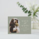 Faites une impression durable avec notre Sage Green Photo Arch Wedding Save The Date Postcard. Avec une calligraphie élégante et votre photo préférée, cette carte postale facilement personnalisable permet à vos invités de marquer leur calendrier avec style. Son design sophistiqué ajoute une touche de classe, donnant le ton parfait pour votre fête mariage inoubliable. Besoin d'aide ? Faites-moi savoir, j'aimerais vous aider !