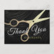 Salon des cheveux / Coiffeur / Coiffeur / Salon de beauté Merci Modèles de carte postale - Ciseaux d'or Faux modernes sur Elégant Motif de cheveux noir et blanc Arrière - plan.