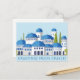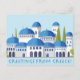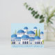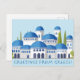 Une illustration numérique d'un village grec avec des bâtiments blancs et des toits bleus compose cette carte postale de style vintage.