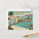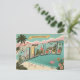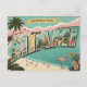 Cette carte postale présente un design vintage classique "Grande Lettre" avec "MIAMI" en évidence. Chaque lettre est remplie de scènes emblématiques et d'éléments de Miami, y compris des palmiers, des plages de sable, des eaux turquoise, une architecture classique, et même un flamand. Sur une bannière au-dessus des lettres, on peut lire "GREETINGS FROM", le tout dressé contre un ciel pastel, capturant le charme nostalgique d'une destination tropicale.