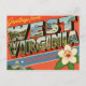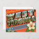 Art de voyage de style vintage avec le design "Greutings From West Virginia". Cette carte postale audacieuse et colorée présente des paysages emblématiques de l'état des montagnes, notamment des cascades, des forêts luxuriantes et le Capitole de l'État. Parfait pour les collectionneurs, les autochtones du WV, ou cadrant comme décor américana rétro. Excellent détail et arrière - plan rayé classique.